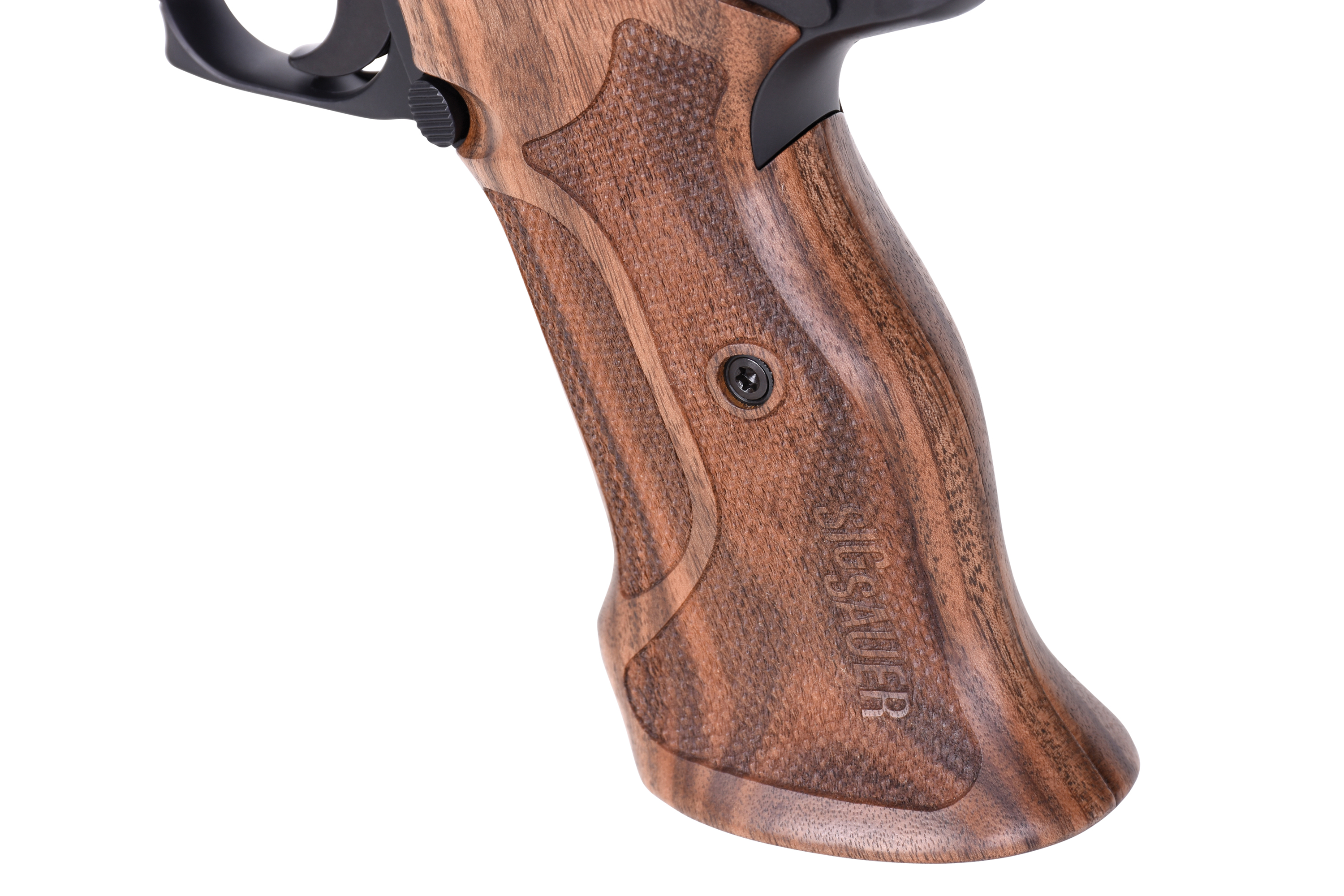Für zusätzlichen Komfort und Stabilität sorgt der ergonomisch gestaltete Target-Griff aus edlem Nussbaumholz. Die speziell angepassten Griffschalen tragen zur hervorragenden Balance der halbautomatischen Pistole bei, was insbesondere bei längerem Schießen von Vorteil ist. Mit einem Abzugsgewicht von 1.560 g bietet die P210 Target einen knackigen Abzug, der die Präzision beim Schießen weiter optimiert. Das Single-Stack Magazin der SIG SAUER P210 Target.