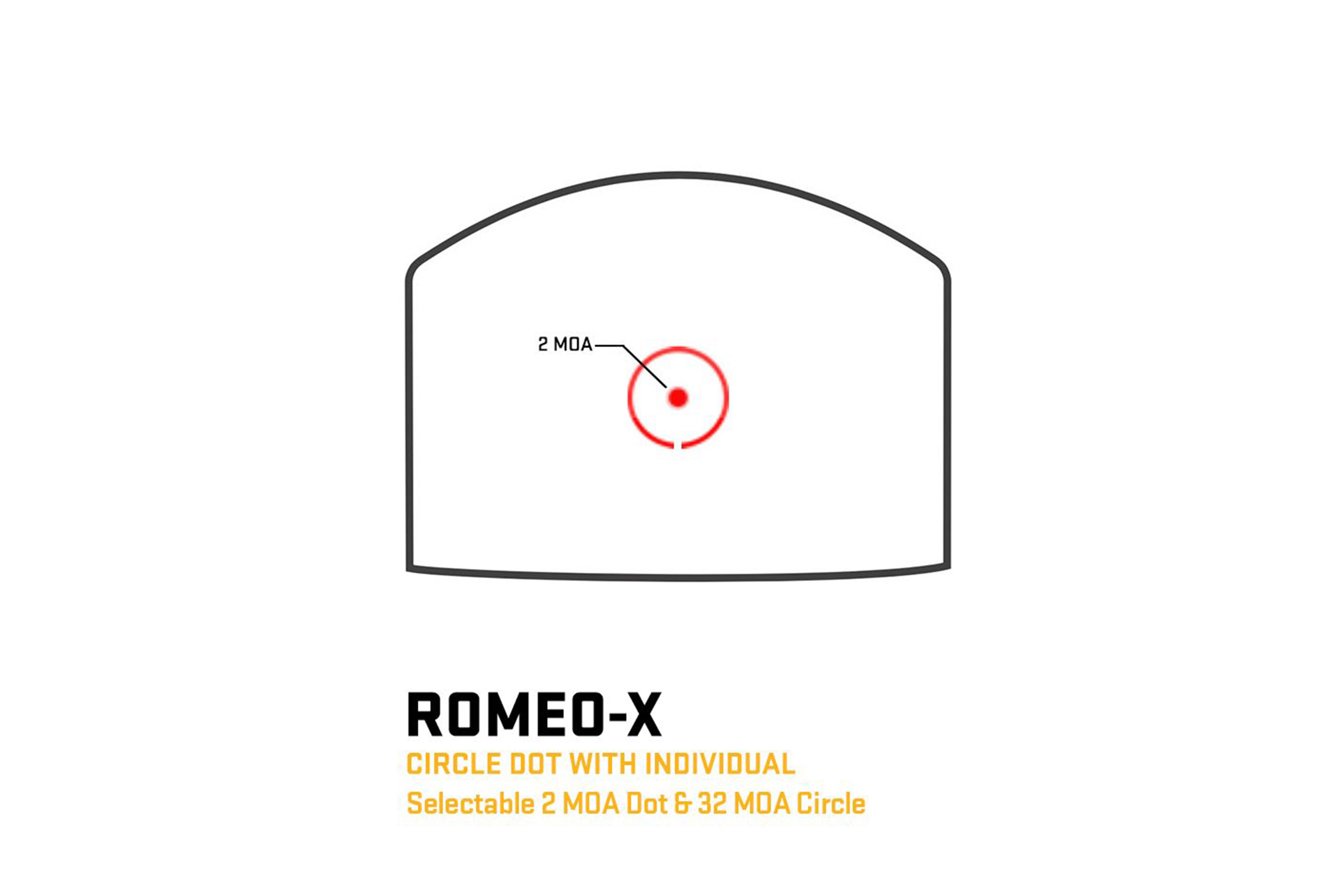 Das SIG SAUER ROMEOX PRO FDE Reflexvisier verfügt über ein Circle Dot Absehen mit 2 MOA Punkt umgeben von einem 32 MOA Kreis und nur 2 MOA Punkt Absehen für eine noch schnellere Zielerfassung.