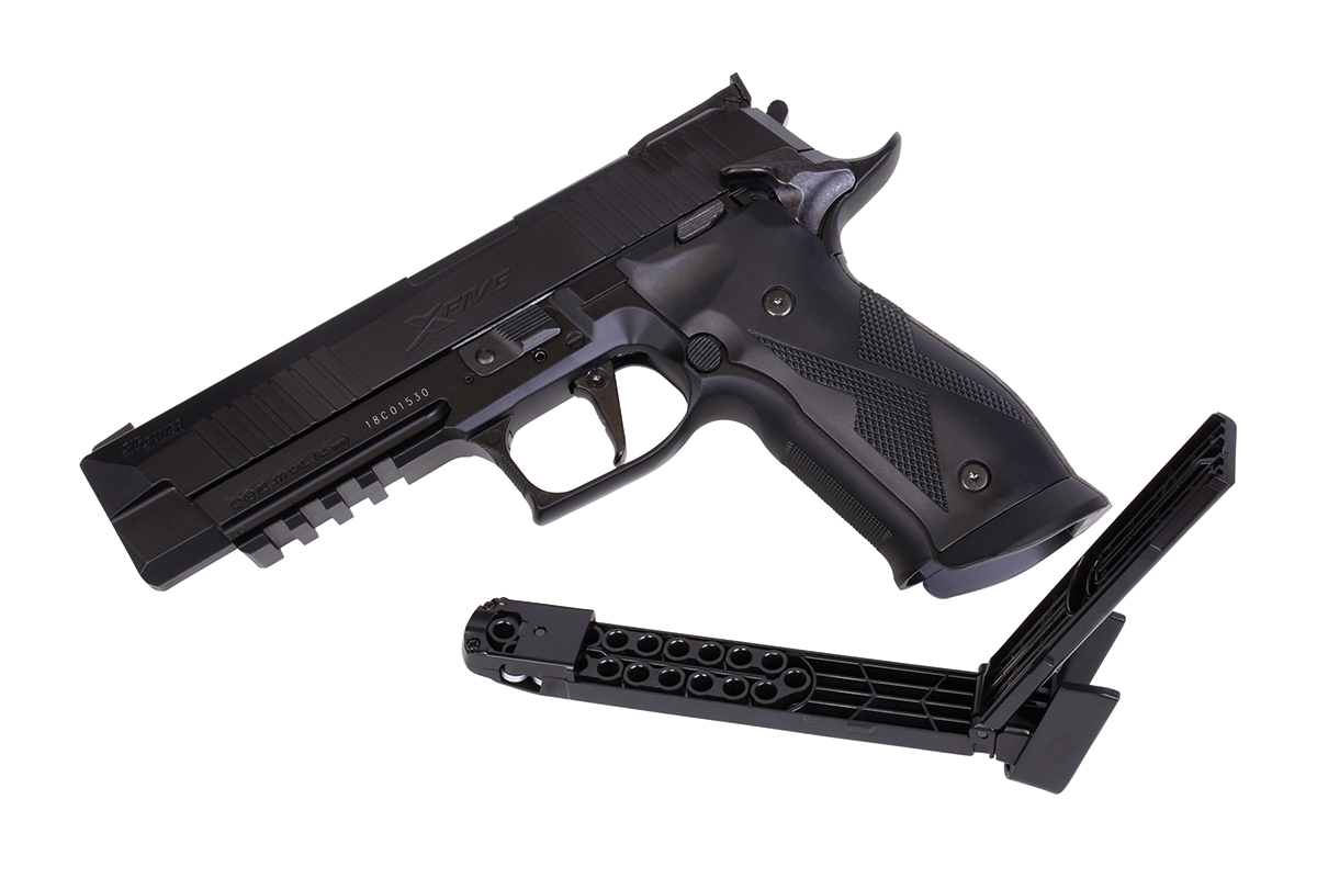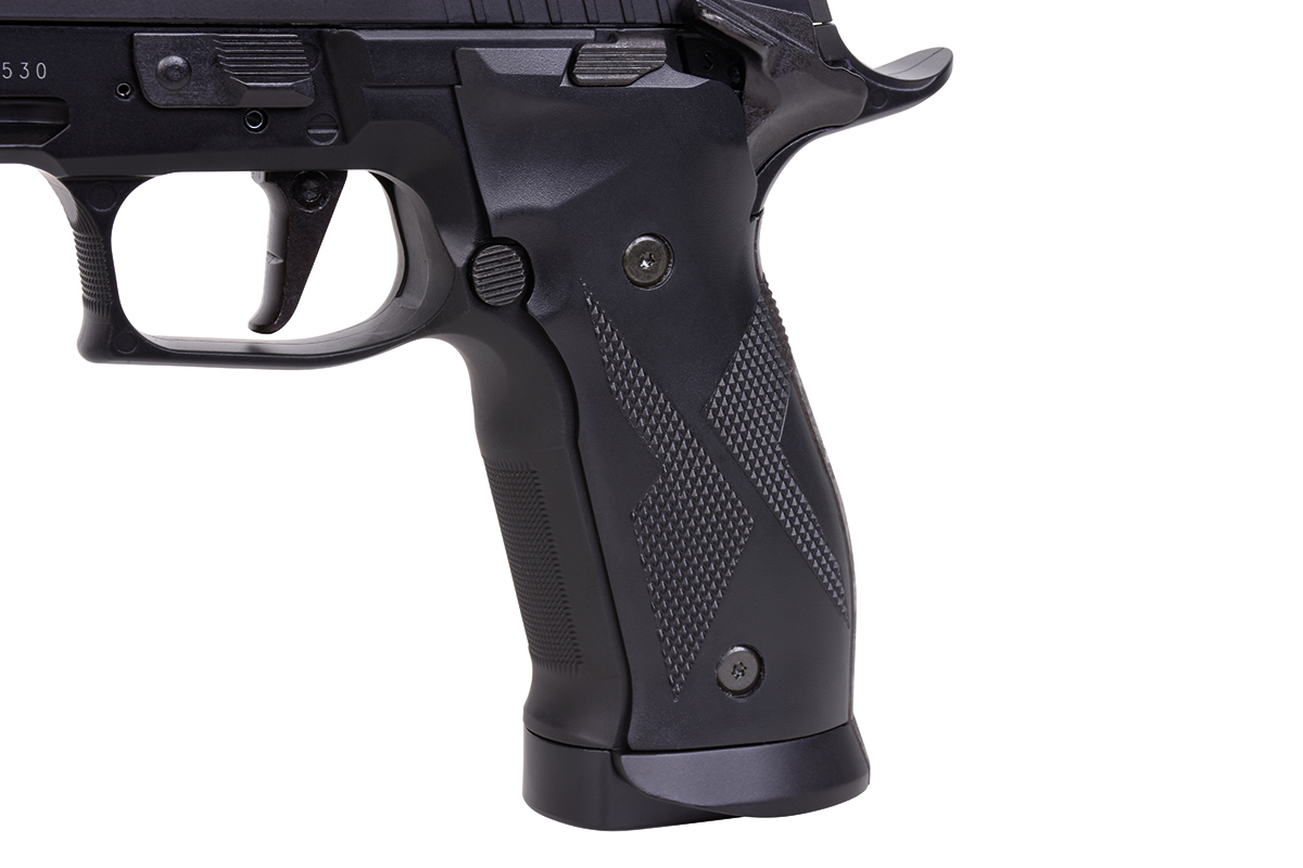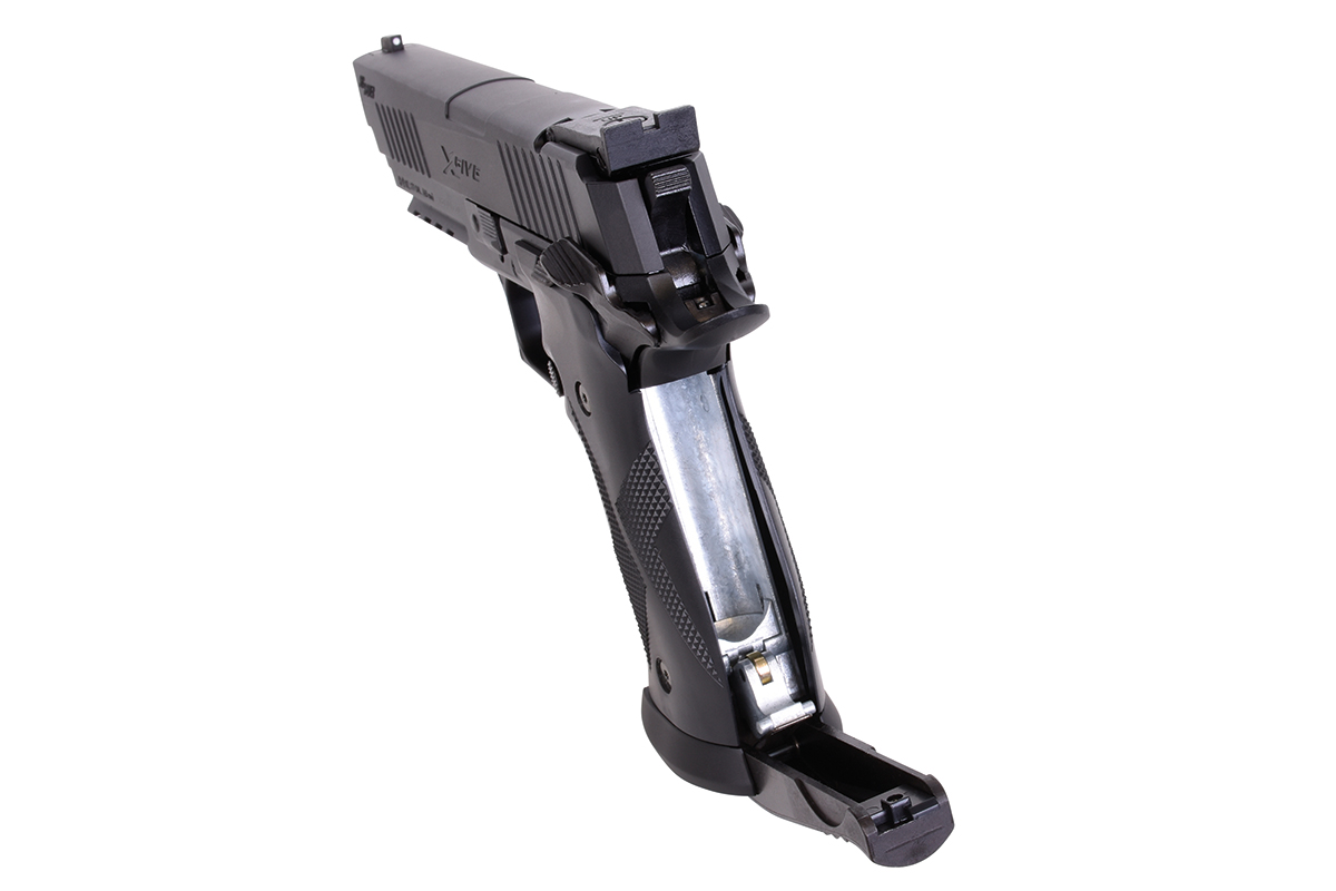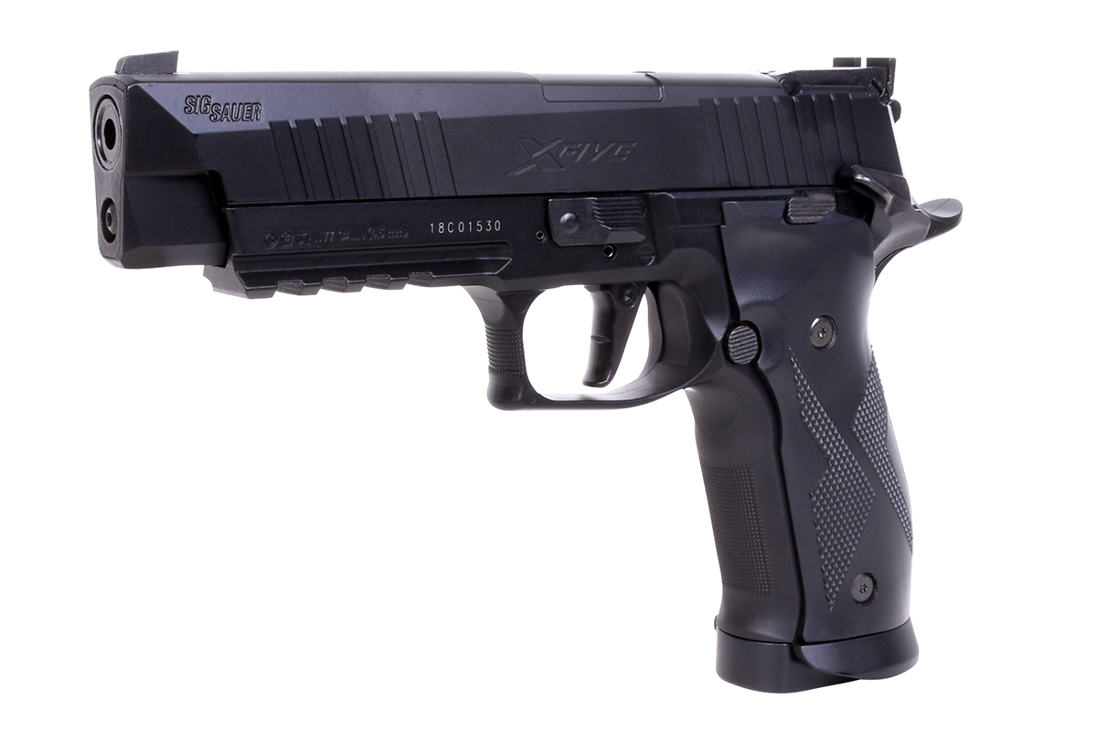 Die Sig Sauer XFive ist eine Co2 Luftpistole und verschießt anders als die echte Pistole Diabolos im Kaliber 4,5mm. Die Luftdruckwaffe ist detailgetreu und lizenzgerecht gefertigt und daher mit Originalmarkings versehen. Du erhältst eine Vollmetall Pistole, d.h. dass sowohl der Schlitten als auch der Body aus Metall gefertigt sind. Lediglich die Griffschalen der Co2 Waffe sind aus Kunststoff. Ein strukturiertes Muster verleiht ihnen einen guten Grip.