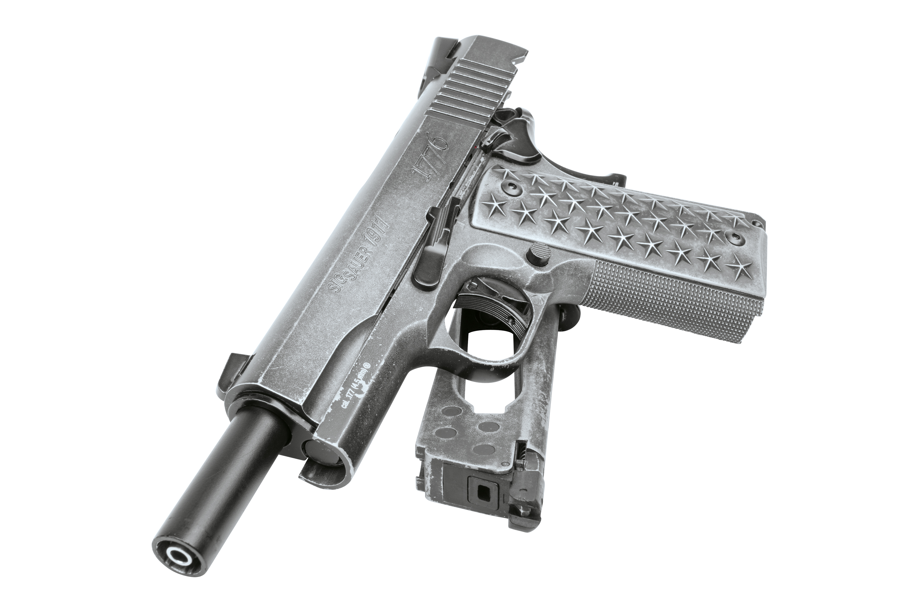 Dieser Nachbau ist eine Co2 Luftpistole und verschießt BBs im Kaliber 4,5mm. Die Sig Sauer 1911 WTP ist eine Vollmetall Pistole, denn sowohl der Schlitten als auch das Griffstück und Griffschalen sind aus Metall gefertigt. Alle Teile kommen im authentischen Used-Look. Sogar das Magazin wurde angepasst. Die Co2 1911 ist detailgetreu und lizenzgerecht und trägt daher auch sämtliche Originalmarkings.