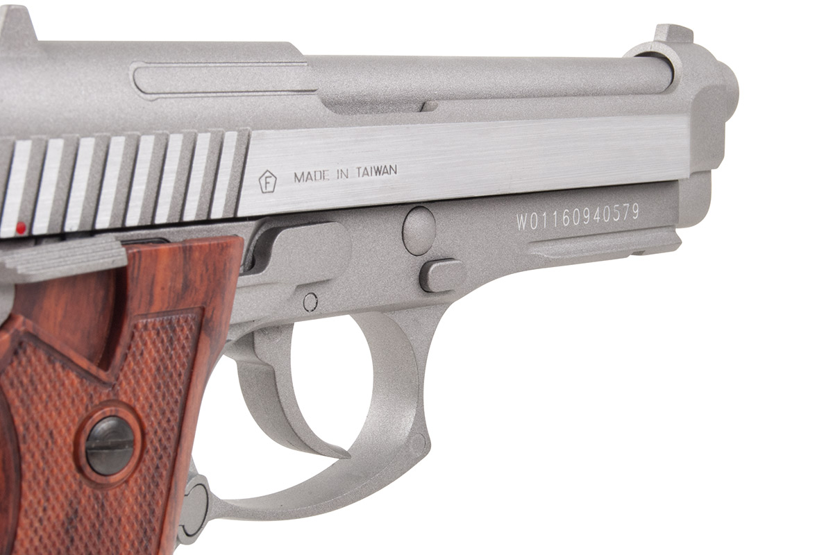 Die Swiss Arms SA92 Co2 Pistole ist eine Druckluft Waffe im Kaliber 4,5mm Stahl BB. Es handelt sich um eine Waffe frei ab 18. Die Druckluftpistole wird mit einer 12g Co2 Kapsel angetrieben und in das vorgesehene Fach im Magazin eingesetzt. Der benötigte Innensechskantschlüssel ist im Lieferumfang enthalten. Wie bei vielen Co2 Waffen üblich, bietet dir auch diese Luftdruckpistole ein BlowBack System. Dieses lässt den Schlitten der SA92 wie beim Original bei der Schussabgabe nach hinten schnellen. Die SA92 Co2 ist detailgetreu unter Lizenz gefertigt und daher mit Originalmarkings versehen. Bei diesem Nachbau handelt es sich um eine Vollmetall Pistole, da sowohl Gehäuse als auch Schlitten aus Metall gefertigt sind. Lediglich die Griffschalen der Luftpistole sind aus Kunststoff in Holzoptik gefertigt. Eine strukturierte Oberfläche bietet dem Sportschützen beim Schießen einen sicheren Halt.
