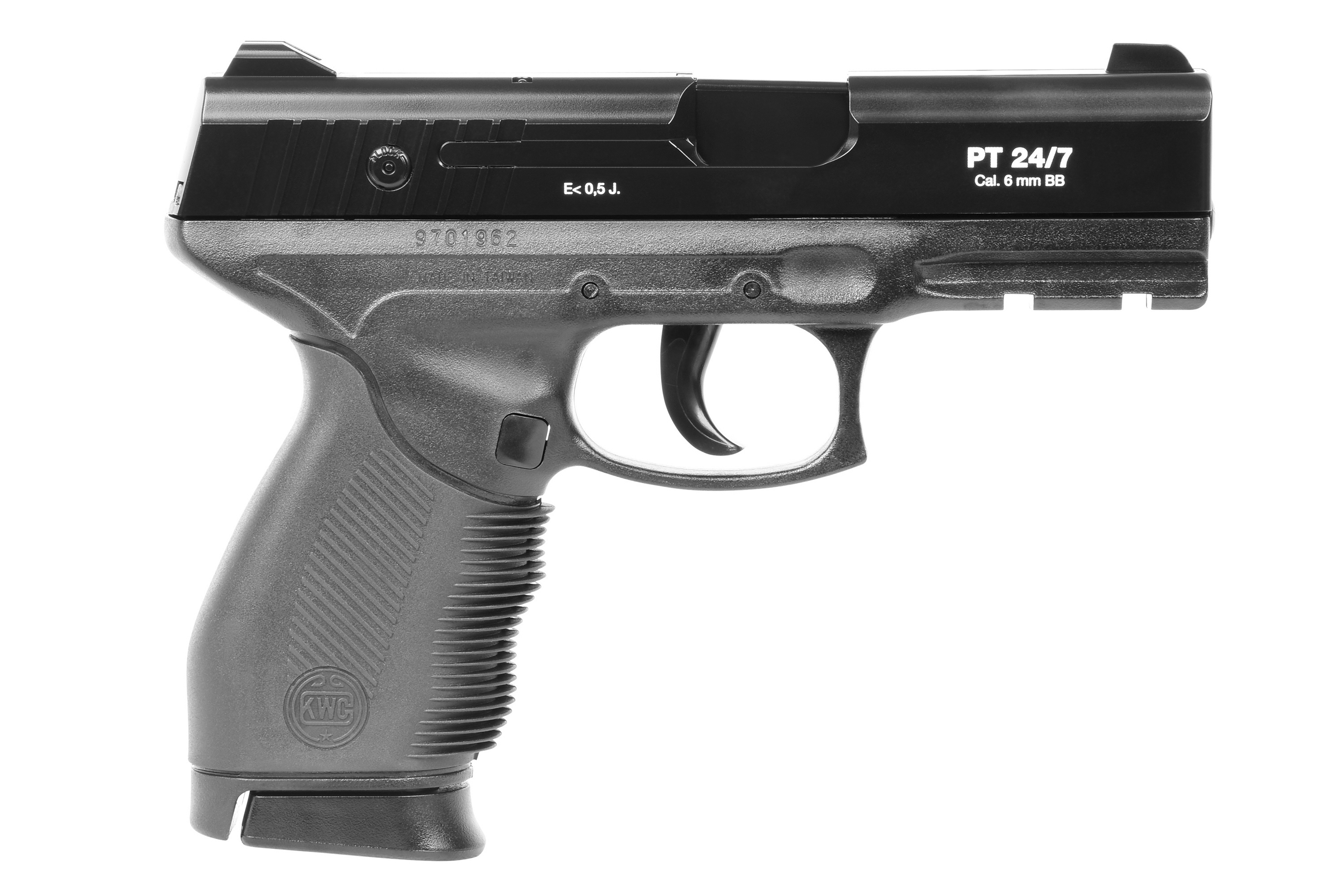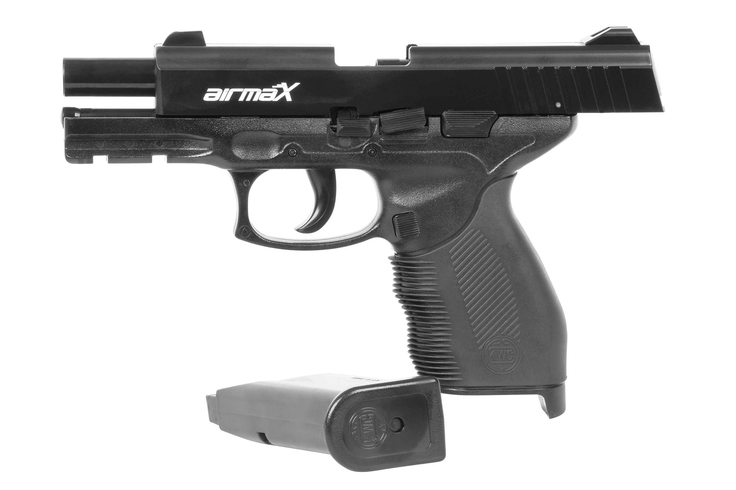 airmaX steht für moderne Airsoft-Waffen mit einem klaren Fokus auf Einsteiger und Freizeitschützen. Die Modelle überzeugen durch robuste Materialien, realistische Details und ein sehr gutes Preis-Leistungs-Verhältnis. Die airmaX PT24/7 wird von KWC gefertigt und ist ein detailgetreuer Nachbau der bekannten PT 24/7 Pistole.